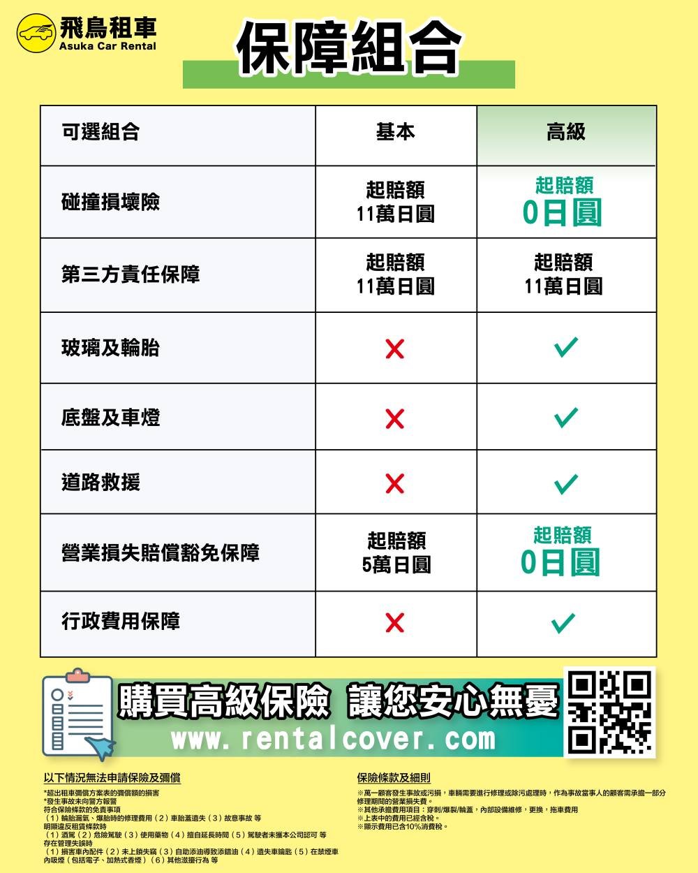 基本費用 | 全保 ($175/24小時計算) | 基本保 ($0/24小時計算) |